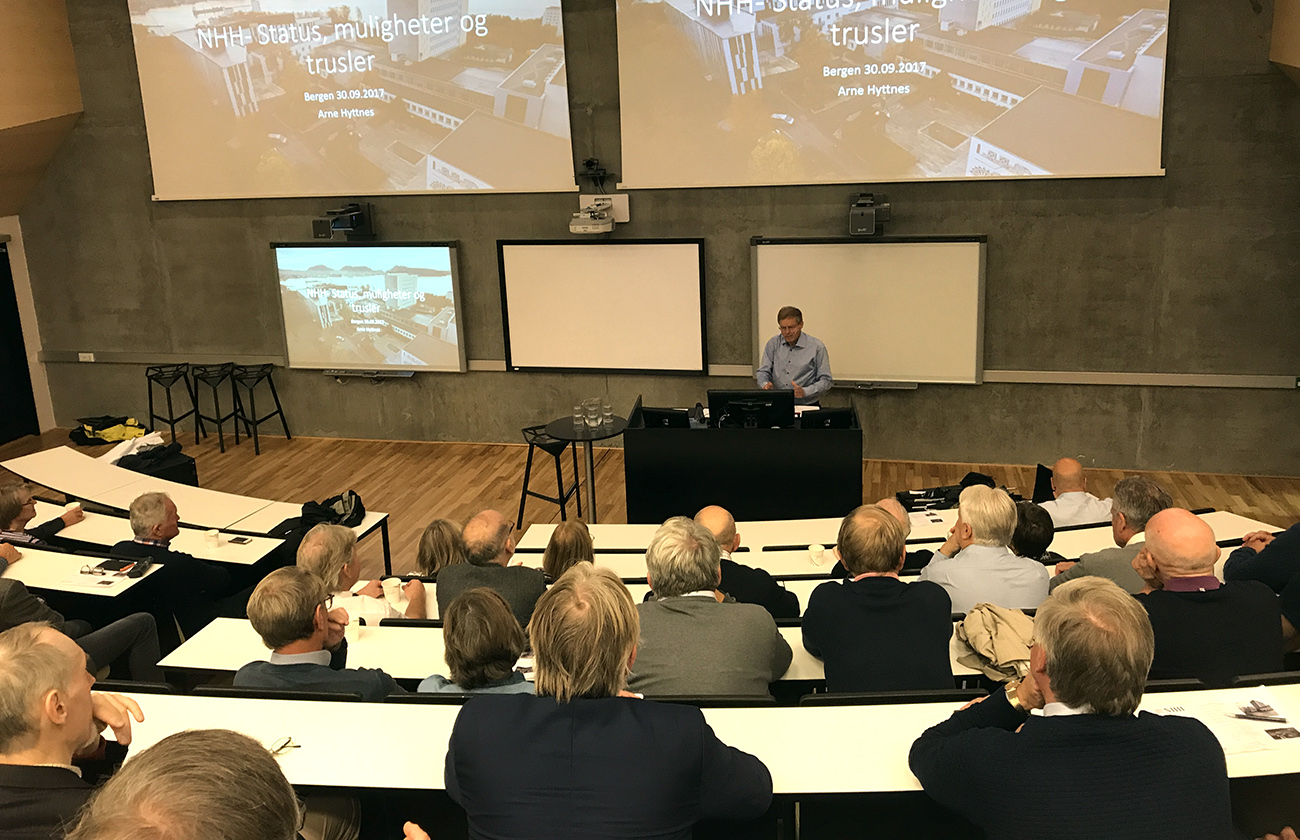 Lørdagen hadde faglig innhold med foredrag av Arne Hyttnes – tidligere medlem av NHH`sstyre – om muligheter og utfordringer for NHH.